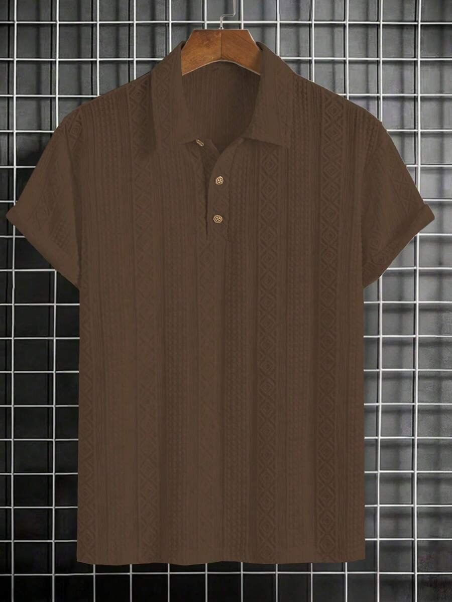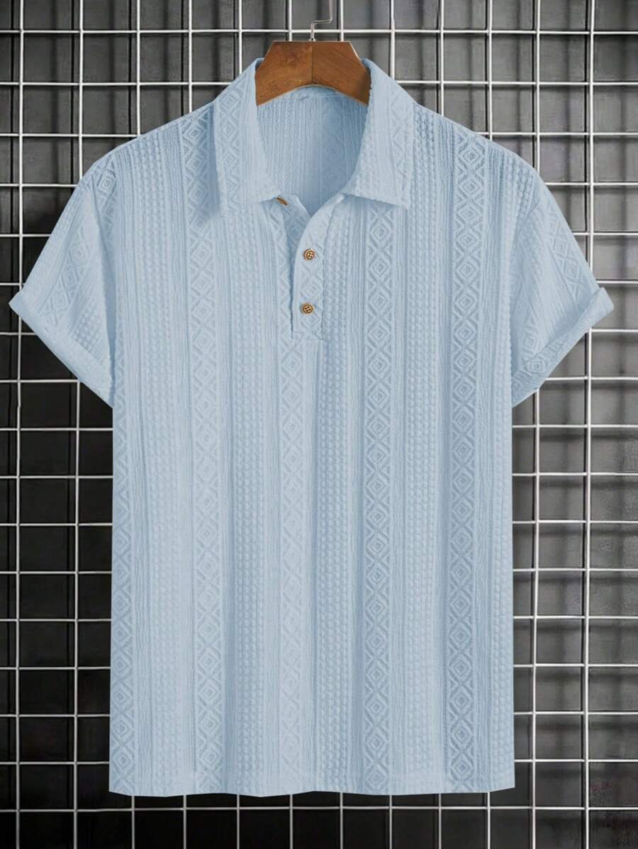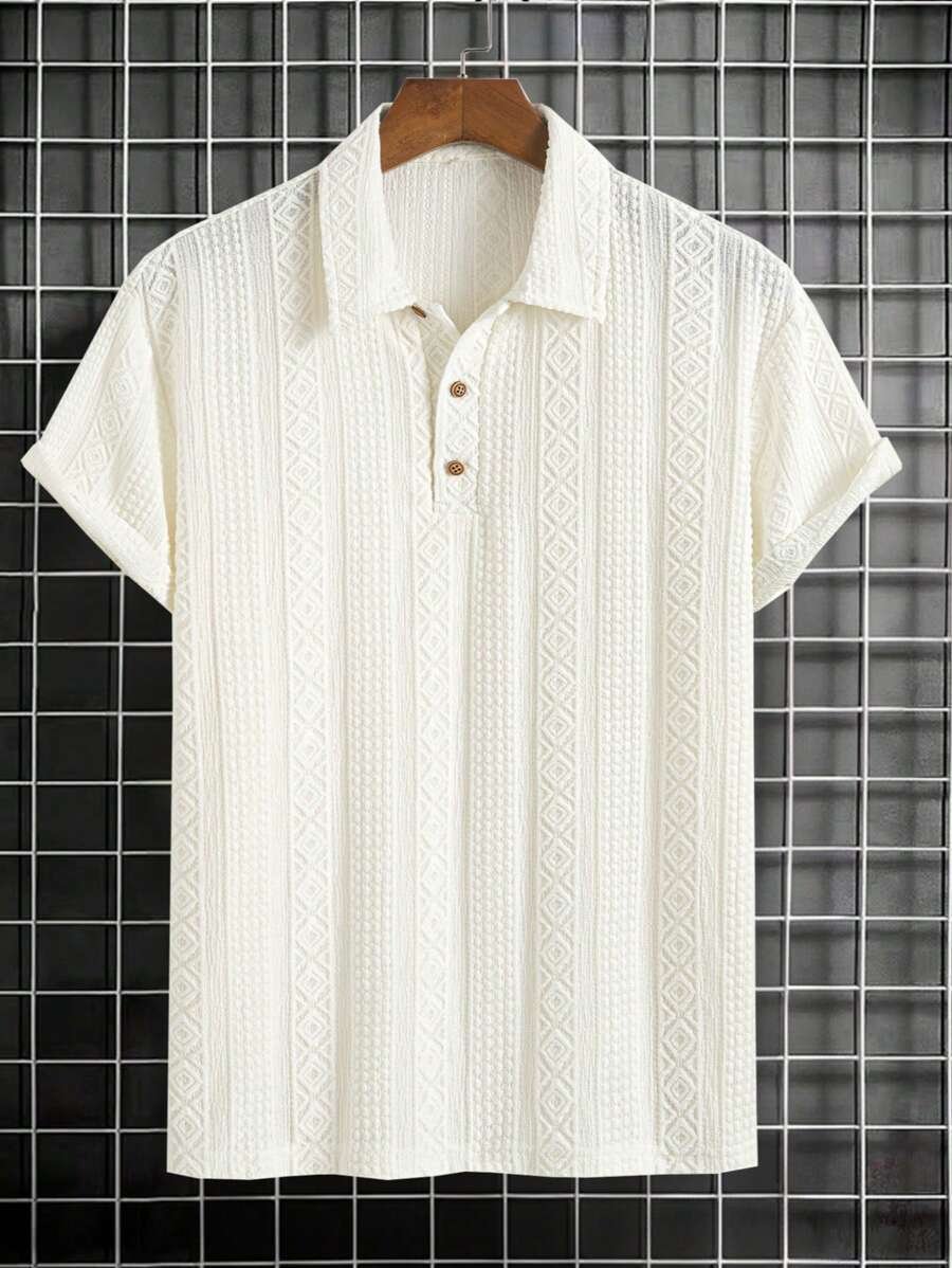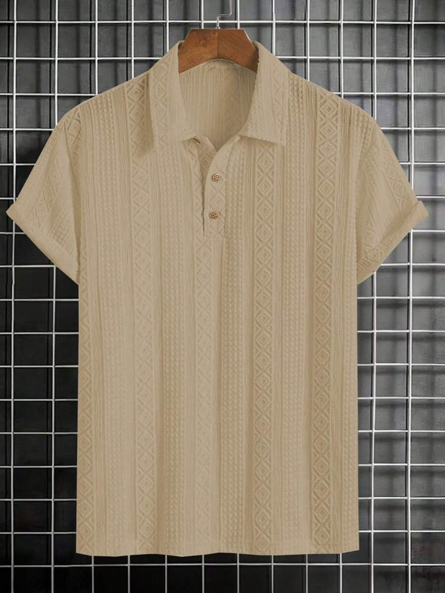ملابس علوية تيشرت كاجوال للرجال، تصميم ياقة نصف زر كلاسيكي باللون الصلب ونسيج هندسي، ملائمة للارتداء اليومي في الصيف، أكمام قصيرة