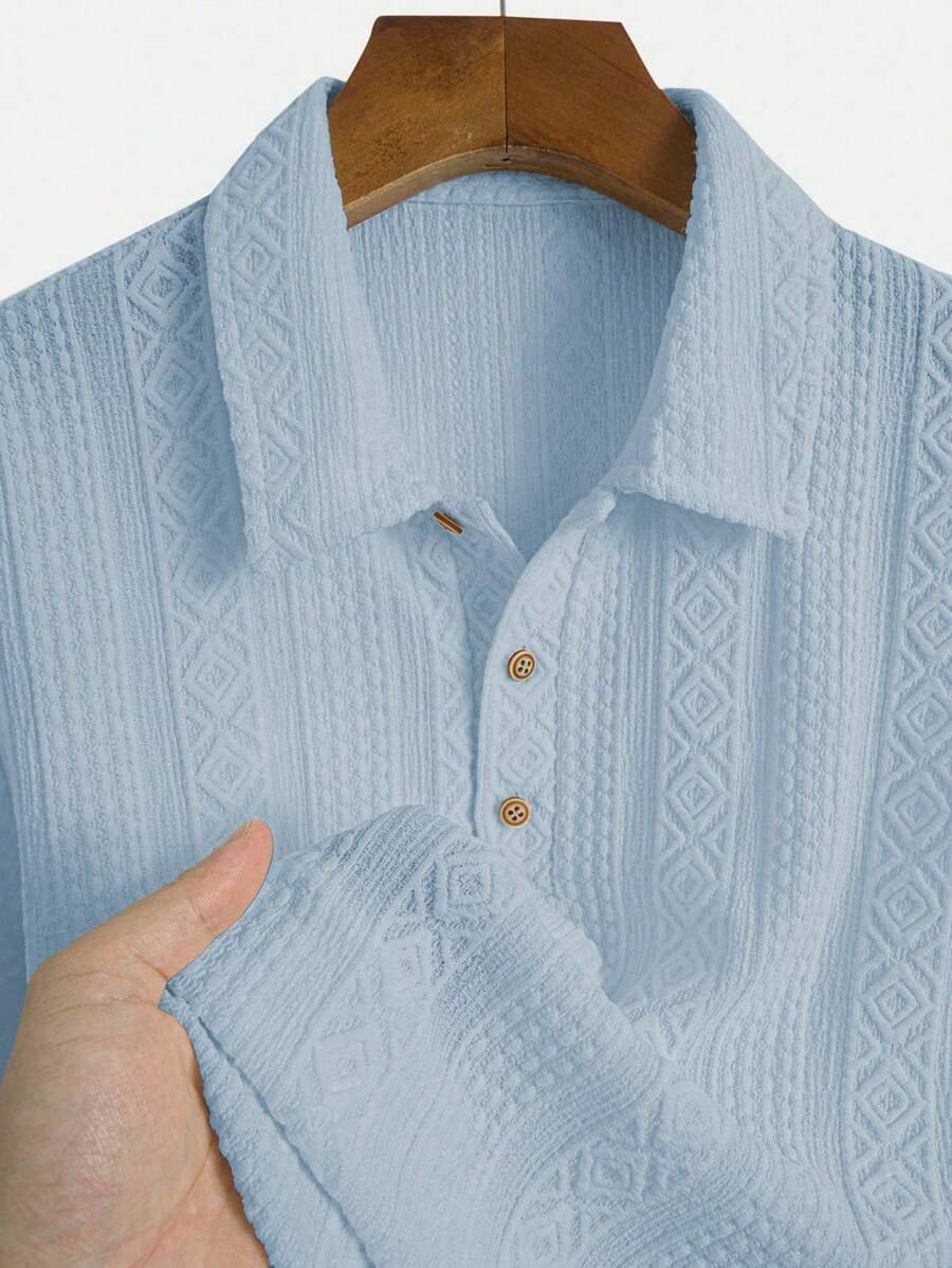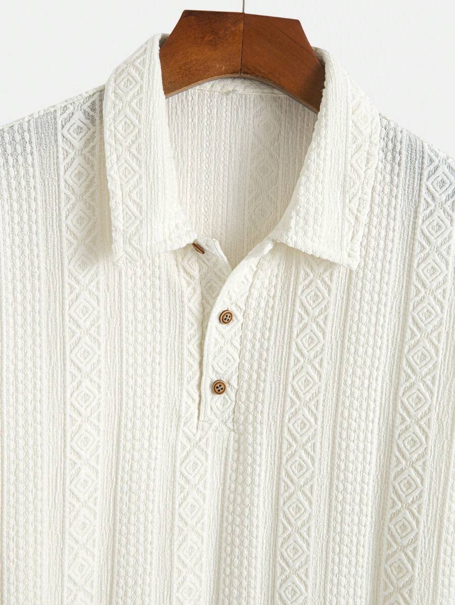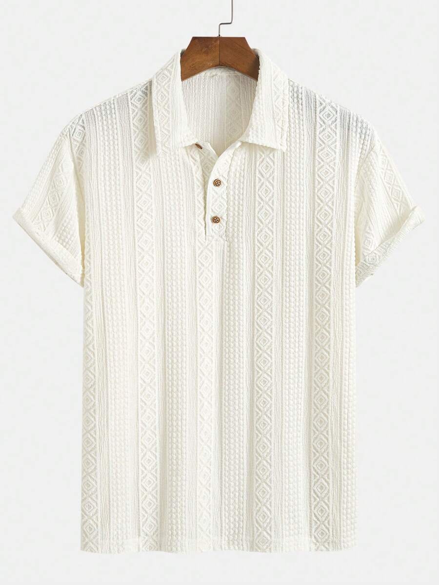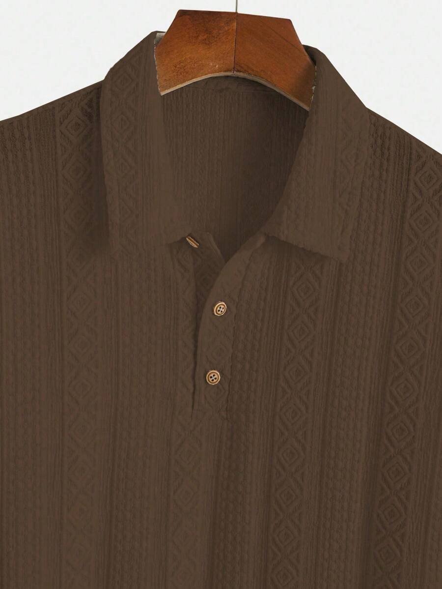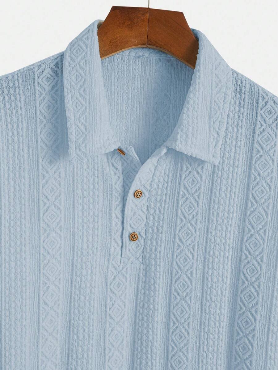 ملابس علوية تيشرت كاجوال للرجال، تصميم ياقة نصف زر كلاسيكي باللون الصلب ونسيج هندسي، ملائمة للارتداء اليومي في الصيف، أكمام قصيرة