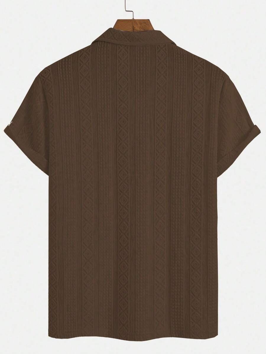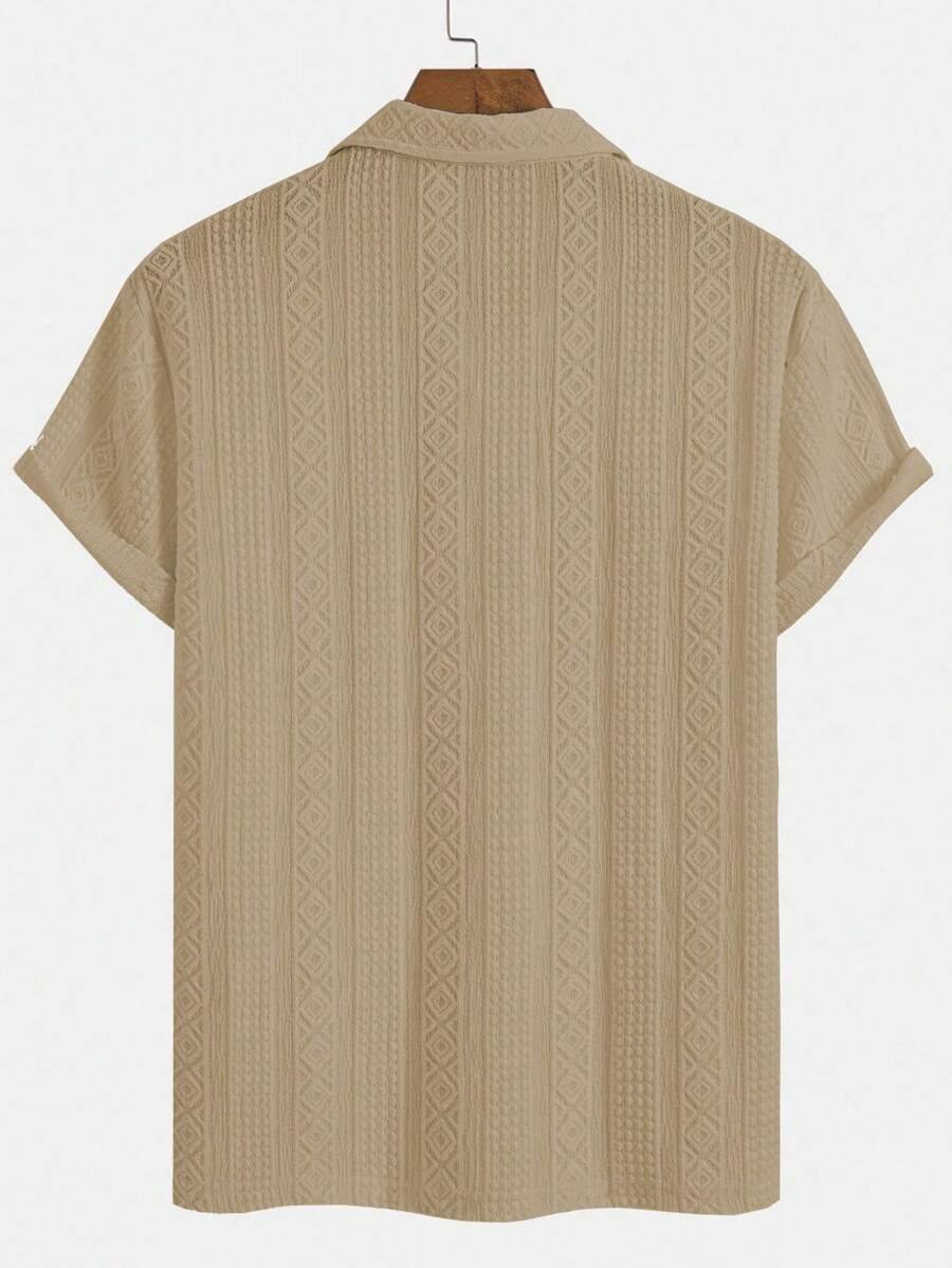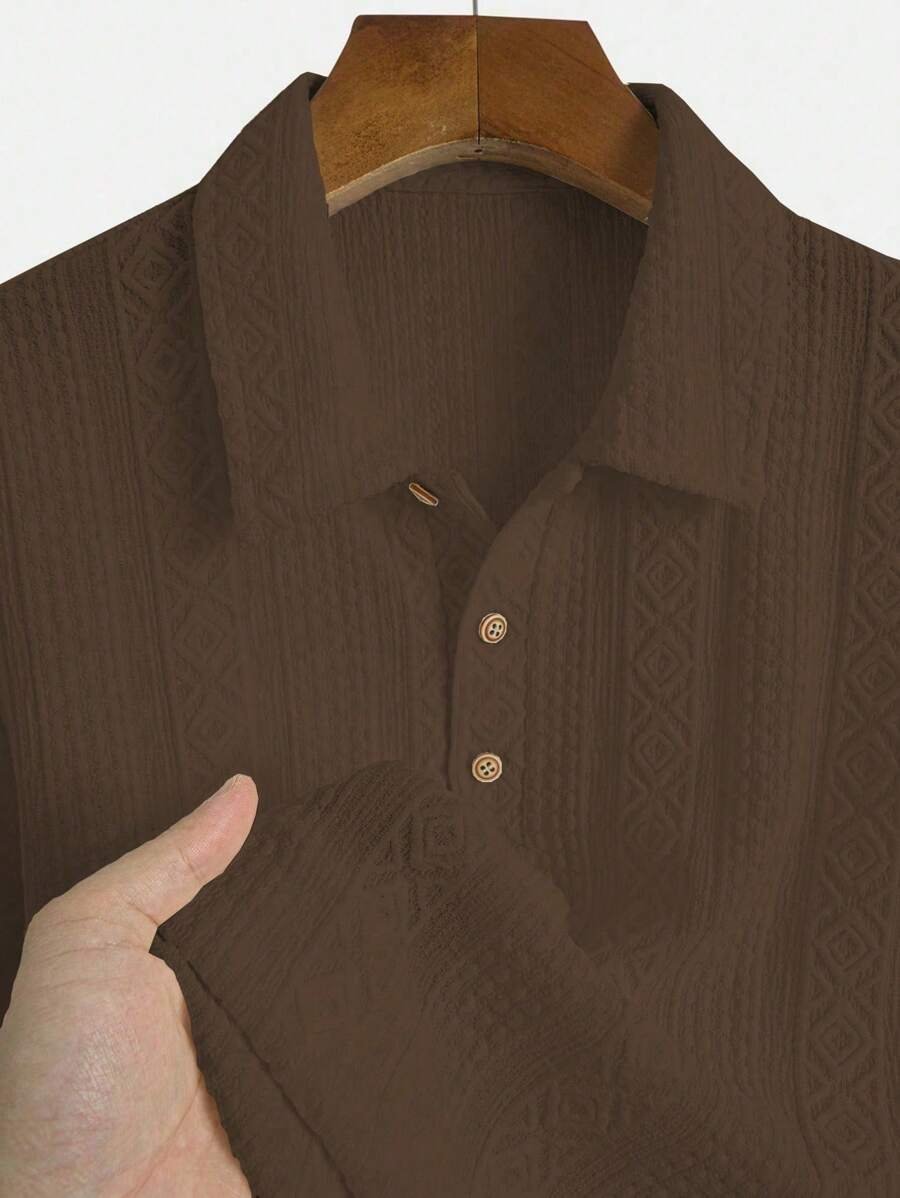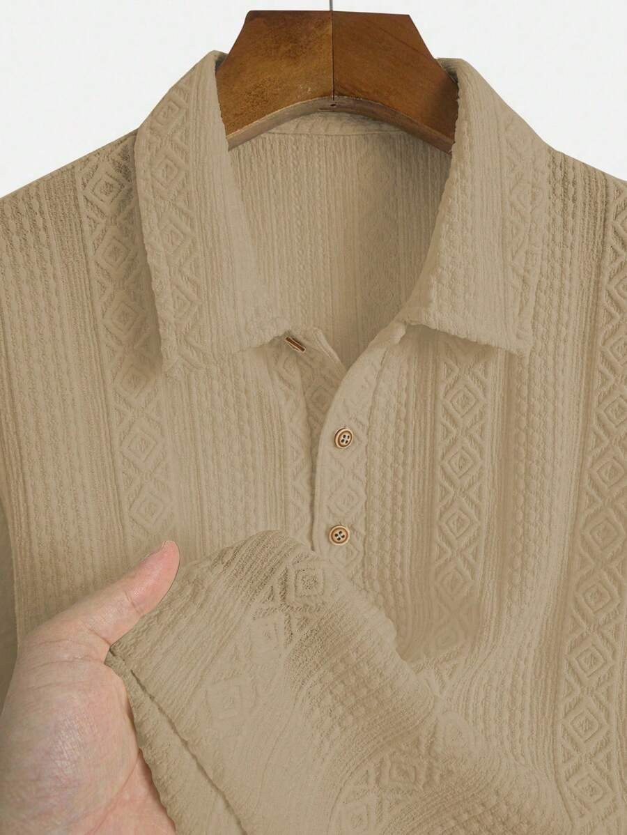 ملابس علوية تيشرت كاجوال للرجال، تصميم ياقة نصف زر كلاسيكي باللون الصلب ونسيج هندسي، ملائمة للارتداء اليومي في الصيف، أكمام قصيرة