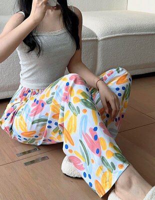 بنطال منزلي واسع الساق من الفسكوز بطبعة زهور كاملة للنساء ، فضفاض ، بنطال كاجوال مستقيم ، بيجامة
