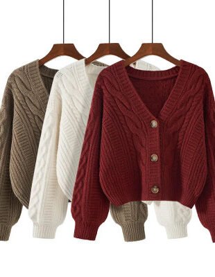كارديجان نسائي كلاسيكي منسوج برقبة على شكل V ، سترة قصيرة ، أحادية اللون ، سترات دافئة غير رسمية ، توبات تريك ، خريف ، شتاء