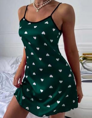 فستان نوم نسائي بألوان متباينة مطبوع عليه قلب من الساتان ذو سطح أملس وحزام سباغيتي